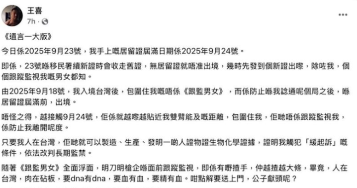 王喜多年前移居英国,后来又去了台湾省,他在文中表示,自己的居留证在9月24日到期,届时无法出境,他不清楚何时拿到新证,但跟踪自己的“男人和女人”知道。